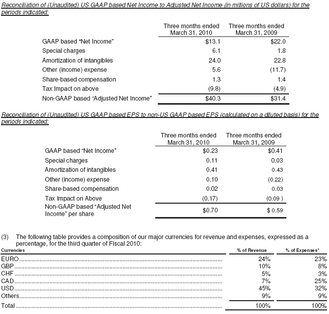 In addition to reporting financial results in accordance with US GAAP, the Company provides certain non-US GAAP financial measures in this press release that are not in accordance with US GAAP. These non-US GAAP financial measures have certain limitations in that they do not have a standardized meaning and thus the Company's definition may be different from similar non-US GAAP financial measures used by other companies and/or analysts and may differ from period to period. Thus it may be more difficult to compare the Company's financial performance to that of other companies. However, the Company's management compensates for these limitations by providing the relevant disclosure of the items excluded in the calculation of adjusted net income and adjusted EPS both in its reconciliation to the US GAAP financial measures of net income and EPS and its consolidated financial statements, all of which should be considered when evaluating the Company's results. The Company uses the financial measures adjusted EPS and adjusted net income to supplement the information provided in its consolidated financial statements, which are presented in accordance with US GAAP. The presentation of adjusted net income and adjusted EPS is not meant to be a substitute for net income or net income per share presented in accordance with US GAAP, but rather should be evaluated in conjunction with and as a supplement to such US GAAP measures. Open Text strongly encourages investors to review its financial information in its entirety and not to rely on a single financial measure. The Company therefore believes that despite these limitations, it is appropriate to supplement the disclosure of the US GAAP measures with certain non-US GAAP measures for the reasons set forth below. Adjusted net income and adjusted EPS are calculated as net income or net income per share on a diluted basis, excluding, where applicable, the amortization of acquired intangible assets, other income (expense), share-based compensation, and restructuring, all net of tax. The Company's management believes that the presentation of adjusted net income and adjusted EPS provides useful information to investors because it excludes non-operational charges. The use of the term "non-operational charge" is defined by the Company as those that do not impact operating decisions taken by the Company's management and is based upon the way the Company's management evaluates the performance of the Company's business for use in the Company's internal reports. In the course of such evaluation and for the purpose of making operating decisions, the Company's management excludes certain items from its analysis, such as amortization of acquired intangible assets, restructuring costs, share-based compensation, other income (expense) and the taxation impact of these items. These items are excluded based upon the manner in which management evaluates the business of the Company and are not excluded in the sense that they may be used under US GAAP. The Company believes the provision of supplemental non-US GAAP measures allows investors to evaluate the operational and financial performance of the Company's core business using the same evaluation measures that management uses, and is therefore a useful indication of Open Text's performance or expected performance of recurring operations and facilitates period-to-period comparison of operating performance. As a result, the Company considers it appropriate and reasonable to provide, in addition to US GAAP measures, supplementary non-US GAAP financial measures that exclude certain items from the presentation of its financial results in this press release. The following charts provide a reconciliation of (unaudited) US GAAP based financial measures to non-US GAAP based financial measures referred to in this press release: