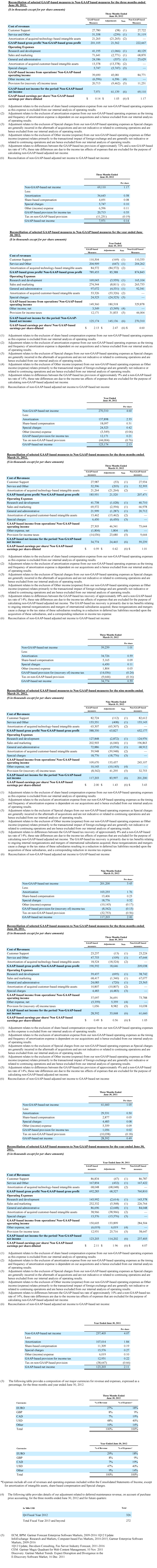 (2) Use of Non-GAAP Financial Measures: In addition to reporting financial results in accordance with US GAAP, the Company provides certain non-US GAAP financial measures that are not in accordance with US GAAP. These non-US GAAP financial measures have certain limitations in that they do not have a standardized meaning and thus the Company's definition may be different from similar non-US GAAP financial measures used by other companies and/or analysts and may differ from period to period. Thus it may be more difficult to compare the Company's financial performance to that of other companies. However, the Company's management compensates for these limitations by providing the relevant disclosure of the items excluded in the calculation of non-US GAAP net income and non-US GAAP EPS both in its reconciliation to the US GAAP financial measures of net income and EPS and its consolidated financial statements, all of which should be considered when evaluating the Company's results. The Company uses the financial measures non-US GAAP EPS and non-US GAAP net income to supplement the information provided in its consolidated financial statements, which are presented in accordance with US GAAP. The presentation of non-US GAAP net income and non-US GAAP EPS is not meant to be a substitute for net income or net income per share presented in accordance with US GAAP, but rather should be evaluated in conjunction with and as a supplement to such US GAAP measures. OpenText strongly encourages investors to review its financial information in its entirety and not to rely on a single financial measure. The Company therefore believes that despite these limitations, it is appropriate to supplement the disclosure of the US GAAP measures with certain non-US GAAP measures for the reasons set forth below. Non-US GAAP net income and non-US GAAP EPS are calculated as net income or net income per share on a diluted basis, excluding, where applicable, the amortization of acquired intangible assets, other income (expense), share-based compensation, and restructuring, all net of tax. The Company's management believes that the presentation of non-US GAAP net income and non-US GAAP EPS provides useful information to investors because it excludes non-operational charges. The use of the term non-operational charge is defined by the Company as those that do not impact operating decisions taken by the Company's management and is based upon the way the Company's management evaluates the performance of the Company's business for use in the Company's internal reports. In the course of such evaluation and for the purpose of making operating decisions, the Company's management excludes certain items from its analysis, such as amortization of acquired intangible assets, restructuring costs, share-based compensation, other income (expense) and the taxation impact of these items. These items are excluded based upon the manner in which management evaluates the business of the Company and are not excluded in the sense that they may be used under US GAAP. The Company believes the provision of supplemental non-US GAAP measures allows investors to evaluate the operational and financial performance of the Company's core business using the same evaluation measures that management uses, and is therefore a useful indication of Open Text's performance or expected performance of recurring operations and facilitates period-to-period comparison of operating performance. As a result, the Company considers it appropriate and reasonable to provide, in addition to US GAAP measures, supplementary non-US GAAP financial measures that exclude certain items from the presentation of its financial results in this press release.