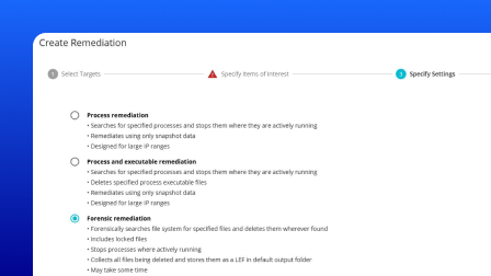Identify compromised systems, isolate affected endpoints, terminate malicious processes, and delete or quarantine infected files, all without disrupting operations.